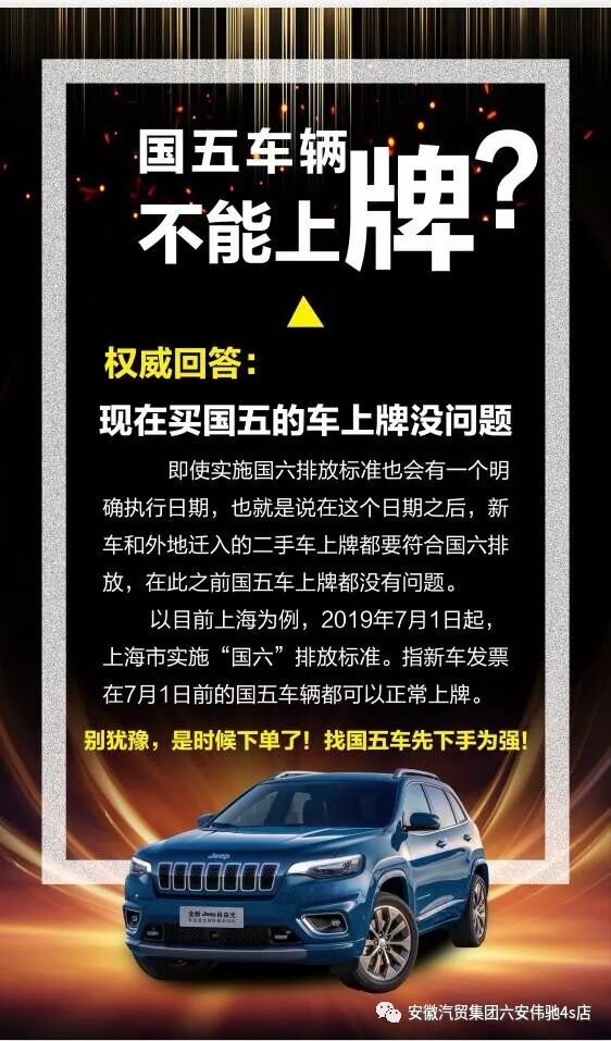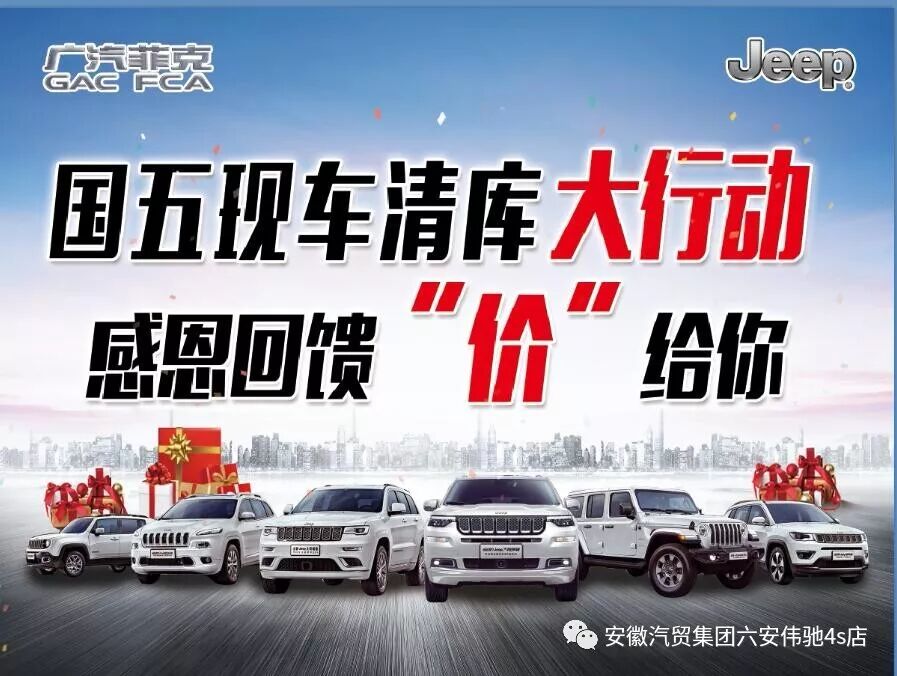 5月25日,Jeep六安伟驰店推出国五现车清库大行动,现交199元抵6000元!!!活动期间订购国五现车,可享受涵盖购车、金融、养车、换车等五重大礼。