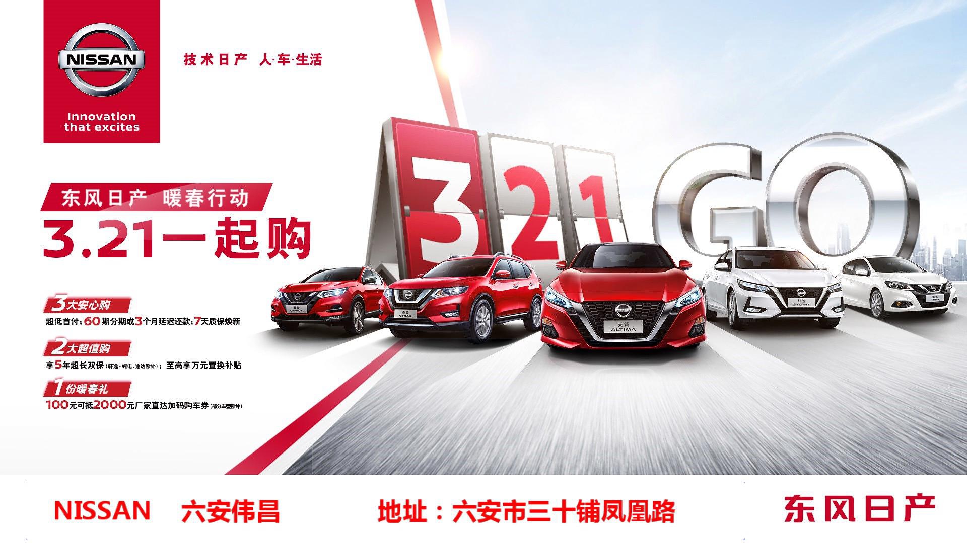 六安【城东三十铺东风日产伟昌4S店】是六安区域东风日产厂家授权的【最大最新最高标准店】本月最新活动〖东风日产暖春行动 321苏皖联动 一起GO!〗独享8重购车豪礼:1. 【暖春豪礼】:购车客户支付100元领取厂家2000元加码购车券(部分车型除外) 2. 【金融减压】:购车客户可享最多3年0息金融方案或3个月0月供缓供金融 3. 【健康专享】:活动期间安徽地区购车客户专享4999元精品健康大礼包 4. 置换加码: 电瓶车等置换蓝鸟劲客至高可享3000元补贴 5. 【 置换政策】:任意品牌置换新车至高可享 13000 元置换补贴 6. 【五年双保】: 购车客户可享5年免费基础保养和5年10万公里保修政策 7. 【感恩专享】: 医护人员购车即可获得空气净化器或者价值1800元感恩礼包 8.【健康专享】:活动期间本店客户可享受4999元健康精品大礼包(N95车内空气过滤器)详细车型信息见下:
