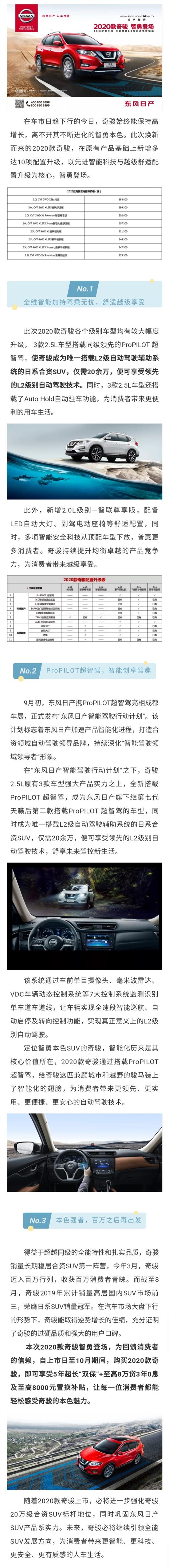 9月20日,东风日产2020款奇骏正式上市,新车共有8款车型,官方指导价18.88万元-27.33万元,10项配置升级,全新搭载L2级自动驾驶辅助系统。