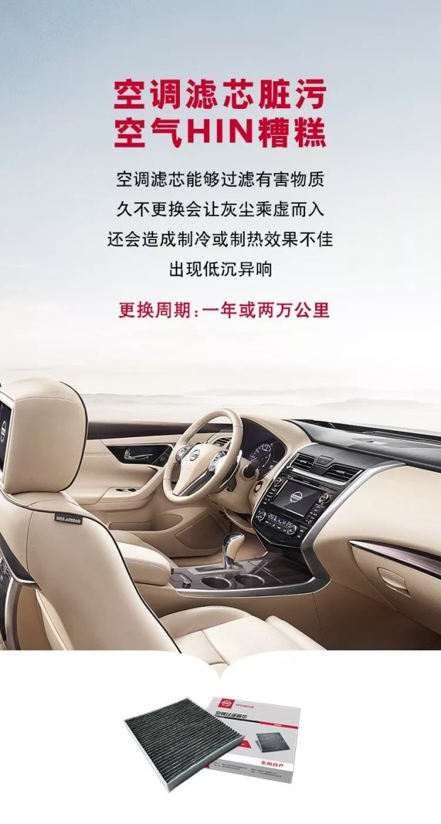 冬季同样需要关注空调滤芯,保证暖风效果和空气清新。东风日产PM2.5空调滤芯轻松过滤由空调系统进入车内的空气和PM2.5悬浮颗粒物,呵护车内健康环境。