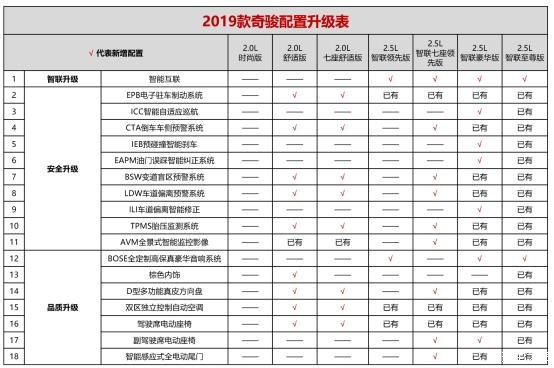 2.5L车型的配置表,升级力度比2.0L车型更强。老款车主最羡慕的,一定是那个Bose音响系统。2019款奇骏有4款2.5L车型,除了智联七座领先版,其他三款都增加了Bose音响。智联七座领先版虽然没有Bose音响,但加入全景影像、副驾驶席电动座椅、智能感应式电动尾门,日常用车更便利。再高一档的智联豪华版,则进一步搭载自适应巡航、主动刹车、油门防误踩系统、车道偏离纠正。