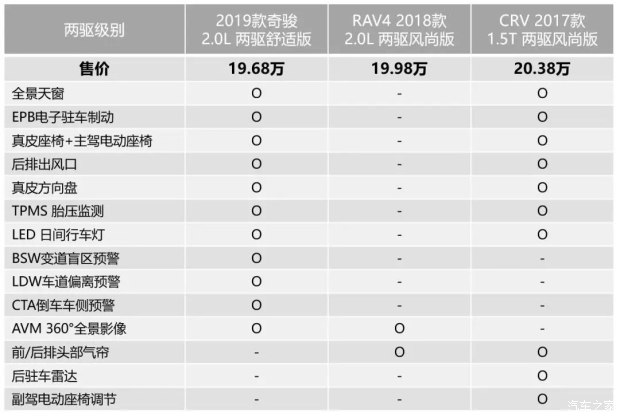 无论奇骏或CR-V或RAV4,20万左右车型都是销售主力。如果拿2019款奇骏2.0L舒适版,跟2018款RAV4 2.0L风尚版,2017款CR-V 1.5T风尚版对比。变道盲区预警、车道偏离预警、倒车车侧预警这三项装备,2019款奇骏独有。CR-V胜在舒适性配置上,如头部气帘、副驾电动座椅,不过CR-V价格要比2019款奇骏高不少。而RAV4则都没有配置。全景天窗、电子驻车、真皮座椅、后排出风口、胎压监测、LED日间行车灯……2019款奇骏多出来的这一大堆配置,相信能让关注的你看出诚意。