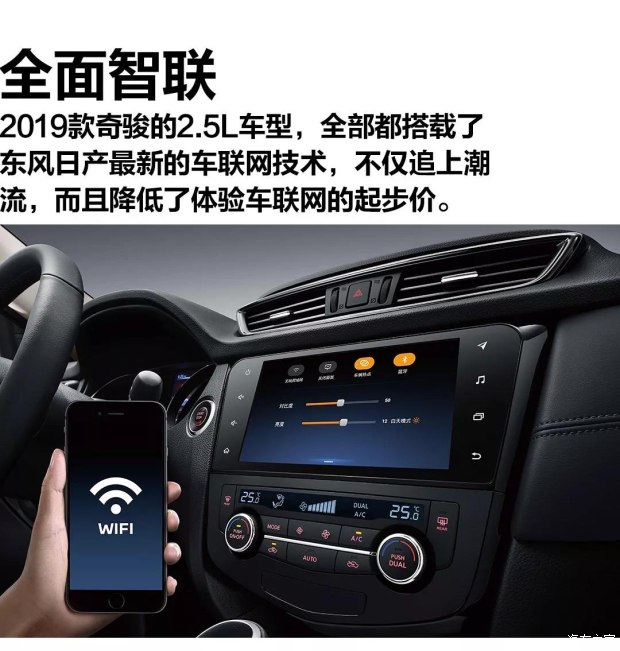 2019款奇骏上市,其中一项重大升级便是2.5L车型全系新增了东风日产的“智行 ”车联系统,该系统涵盖智能语音控制、车载全时导航、远程实时监测、24小时娱乐、车载Wi-Fi热点、流量无忧6大前沿科技,对于生活在2018年的你来说,2019款奇骏紧跟潮流潮流,通过语音操控车内功能,全时在线的地图导航,远程监控车辆状态等玩法通通可以实现,而且全部2.5L车型都有配备,降低了体验车联网的起步价。