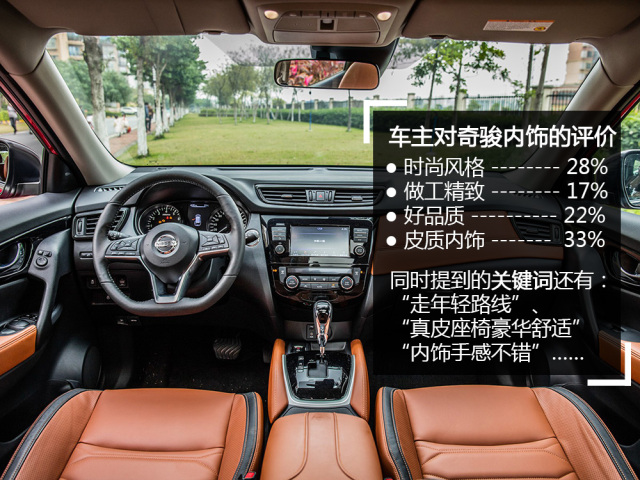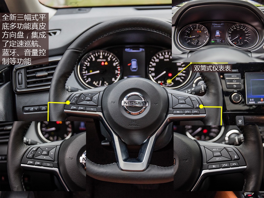 全新奇骏全系更换D型多功能方向盘(集成了定速巡航、蓝颜、音量控制等功能),同时新增的棕色内饰搭配更高级的用料。颇有几分小钢炮车型味道的方向盘设计为内饰的运动感增分了不少,握感相当不错。