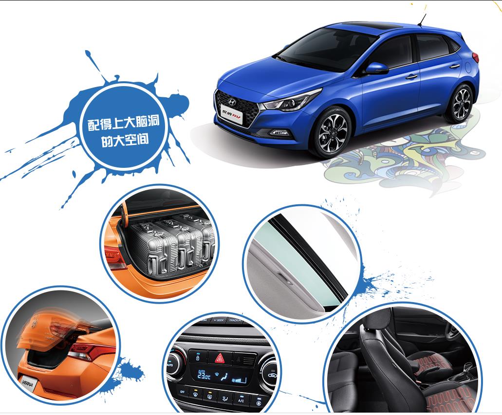 ,carplay/carlife·智能手环解锁,使用率50%超高张力钢板,以及超长轴距2600MM,让汽车生活更加便捷,智能。 悦纳是现款瑞纳的换代车型,定位高于瑞纳,上市后瑞纳并不会停产,而是与悦纳同堂销售.悦纳与早先上市的领动一样都采用现代家族最新设计语言,外观看上去有小号“领动”的味道,多条幅镀铬六边形大嘴式中网、短尾溜背设计都延续了领动的设计精髓。内饰采用时尚而富有活力的Modern Elegance设计理念,配置方面包括7英寸触摸屏(支持CarPlay功能)、一键启动、无钥匙进入、多功能方向盘、蓝牙电话、车身稳定系统、天窗、AUV/USB接口等一应俱全。