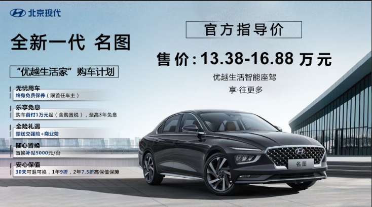 全新一代名图此次共推出5款车型,售价区间13.38-16.88万元。新车外观极为颠覆,与上代车型完全不同。此外,新车针对车身结构进行了优化,动力方面则将提供1.8L和1.5T两种动力配备可供选择。外观方面,新一代名图采用新潮的瀑布式前格栅以及由曲线构成的保险杠,并采用了与第十代索纳塔相同的扁平化设计,车头整体风格更低趴、更运动,横向视觉效果更强。并且头灯整体被设计成了上下连接的分体式,简洁而时尚,很有辨识度。车侧部分,新车采用了简练又高级的流线型车身。全新设计的立体式大尺寸轮毂与流线型车身相得益彰,为整体造型增添了独特美感和运动感。车身尺寸方面,新车的长宽高分别为4780/1815/1460mm,轴距为2770mm。车尾造型采用与第十代索纳塔有点类似的设计元素,均使用了门形贯穿式尾灯,多折角设计则带来了更强的立体感,夜间识别度更高。全新名图在内饰部分基本延续了现代家族式的风格,两块大尺寸液晶显示屏相连,营造了极强的科技感,并且中控按键大部分都采用了无实物触控式。虽然新一代名图整体风格与第十代索纳塔很接近,但是有所不同的是,新一代名图采用了拼色设计,卡其色成为了内饰主基调,黑白两色则形成了撞色装饰。相对来说,新一代名图在内饰方面的表现,比第十代索纳塔的内饰整体造型更新颖、更有质感。配置上,新车针对车身结构进行了优化,并搭载了23项ADAS自动驾驶辅助系统。新车还配有真皮座椅,其颜色与内饰整体基调颜色相得益彰,座椅的支撑性和坐垫的柔软性都非常不错。动力方面,新车提供1.8L和1.5T两种动力配备可供选择,其中1.8L发动机最大功率104.8kW,最大扭矩175.5N·m,与之匹配的是CVT变速箱;1.5T发动机最大功率125kW,最大扭矩253N·m,与之匹配的是7速双离合变速箱。