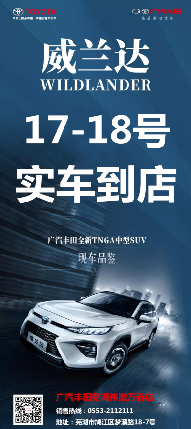 3月17号18号威兰达实车到店 要看车的伙伴赶紧联系您的专属销售顾问 咨询热线:0553-2112111 地址:芜湖市鸠江区梦溪路18-7号