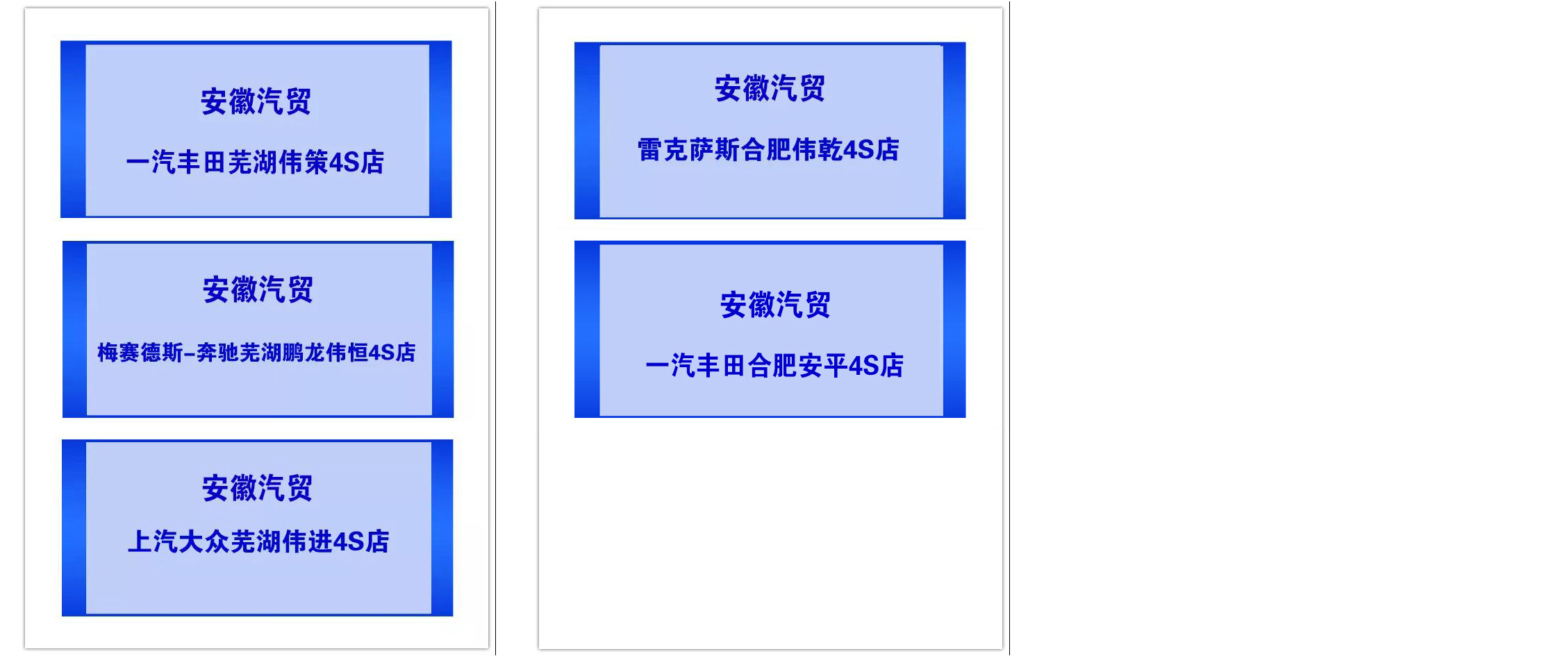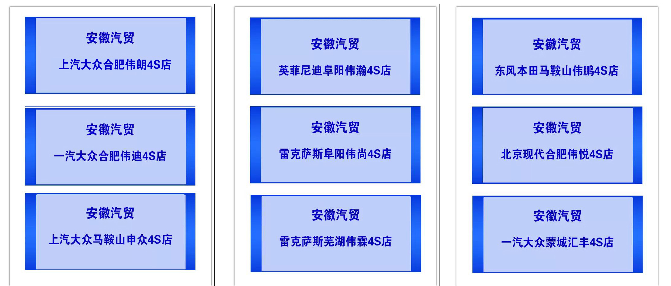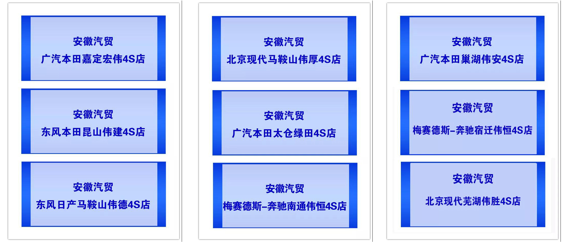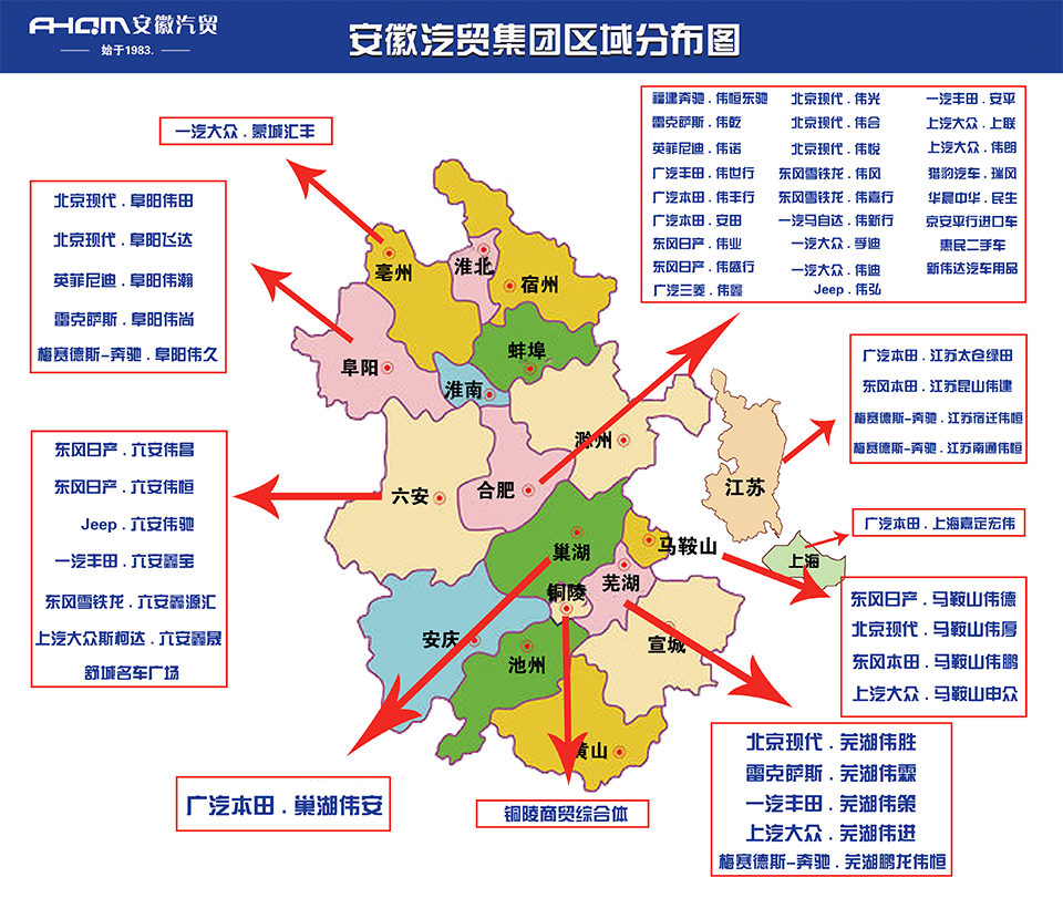 安徽汽贸始建于1983年,是安徽乃至全国汽车服务行业历史最为悠久,并具有相当规模的汽车服务企业。上世纪80年代初,安徽汽贸就已成为国内主要汽车生产厂家在安徽省为数不多的省级代理商,并率先于1995年建成省内首家具备四位一体功能的汽车专营店,随后又陆续在安徽合肥投资数家汽车品牌的安徽首家四位一体专营店。近年来,随着经营网络的逐步拓展,已在省内主要的二、三线城市投资建店,并已延伸至长三角经济发达地区。目前,集团已建成汽车4S店50余家,覆盖了梅赛德斯-奔驰、雷克萨斯、英菲尼迪等国内外高中端20多个品牌。